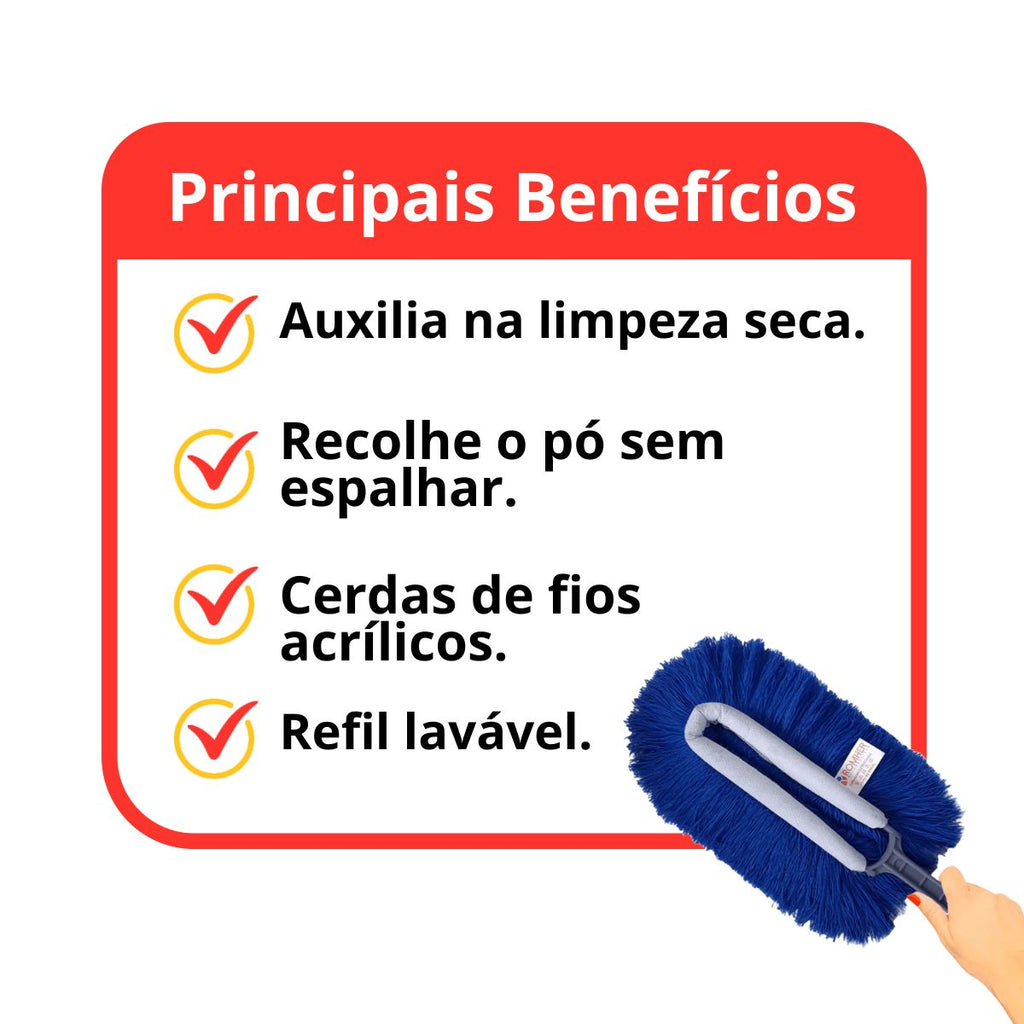 Através da estática, criada pelo atrito de suas cerdas este espanador retira o pó sem espalhá-lo pelo ambiente prevenindo doenças e prejuízos a instalações e equipamentos.